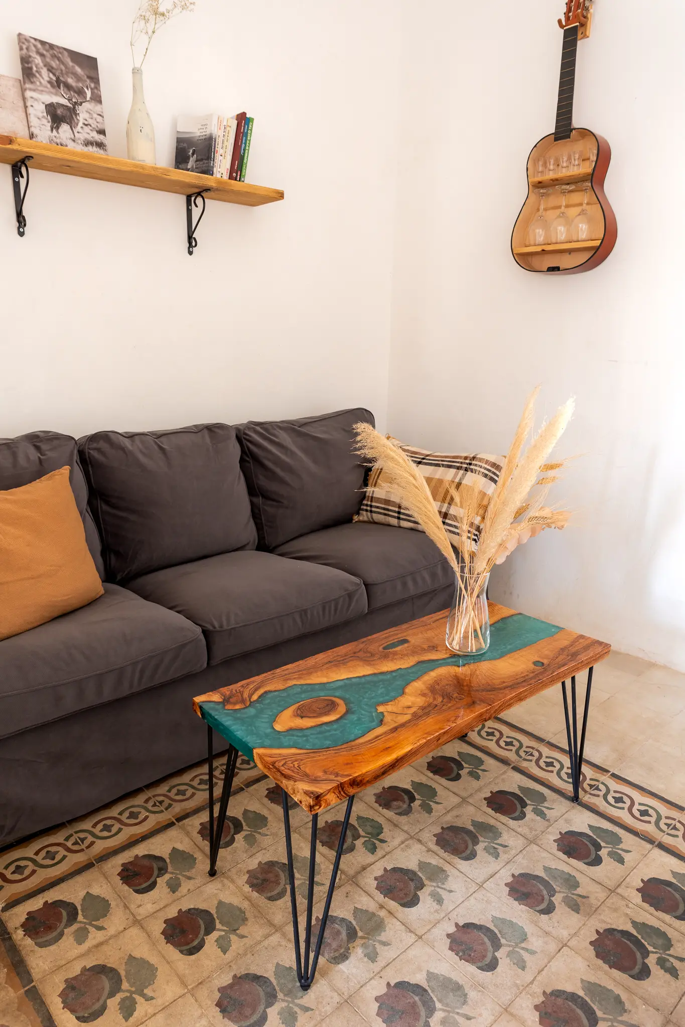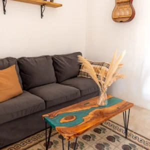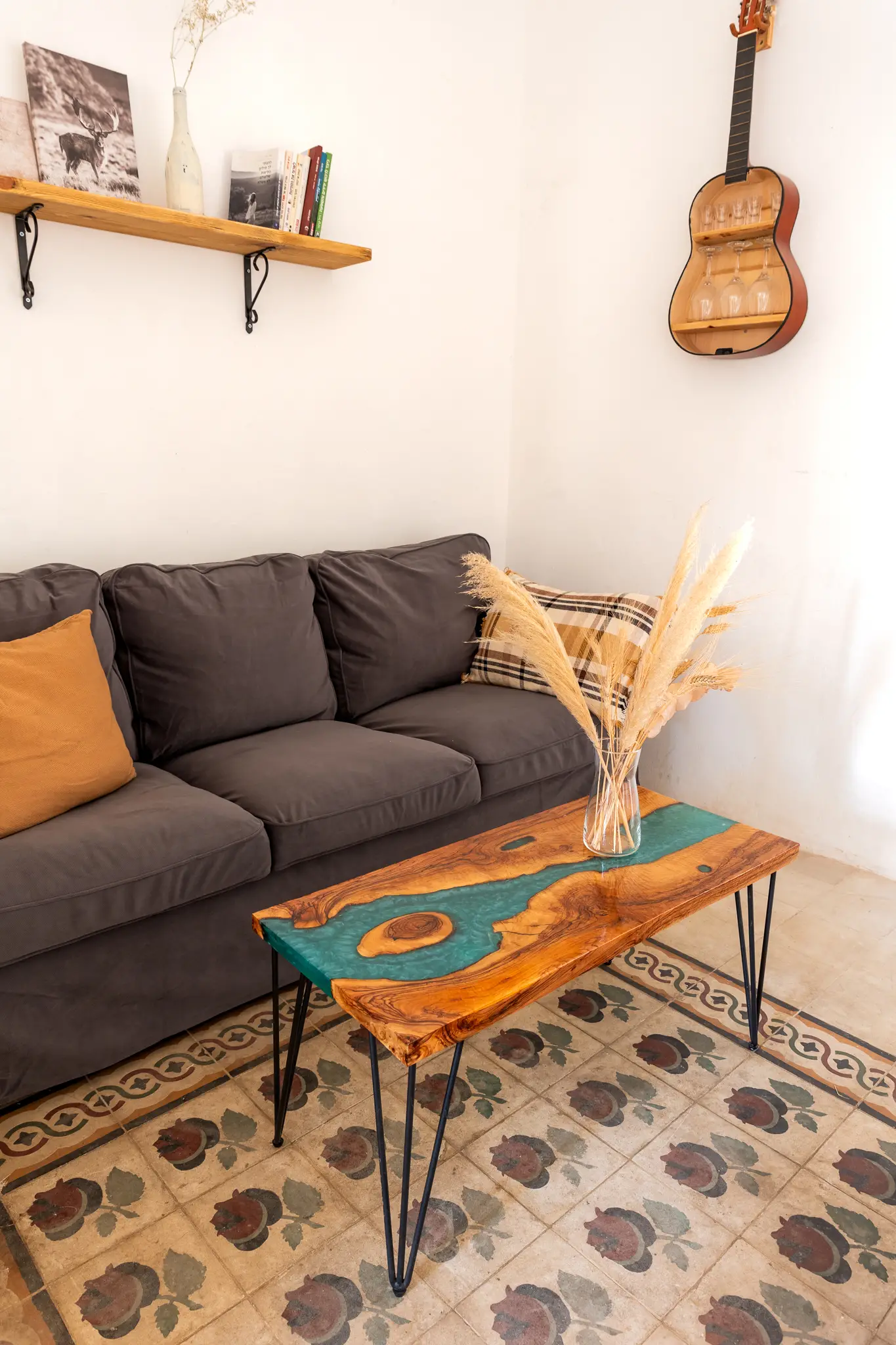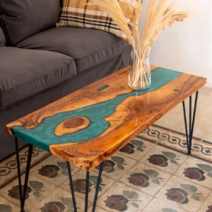 שולחן סלון מרהיב ביופיו, עשוי בעבודת יד מעץ טבעי בגוון חום-דבש עשיר, המשולב באפוקסי בגוון טורקיז שקוף עם עומק גלי. העיצוב מדמה זרימה של נהר בין גדות עץ פראיות – ממש כאילו נלקח מתוך נוף טבעי.