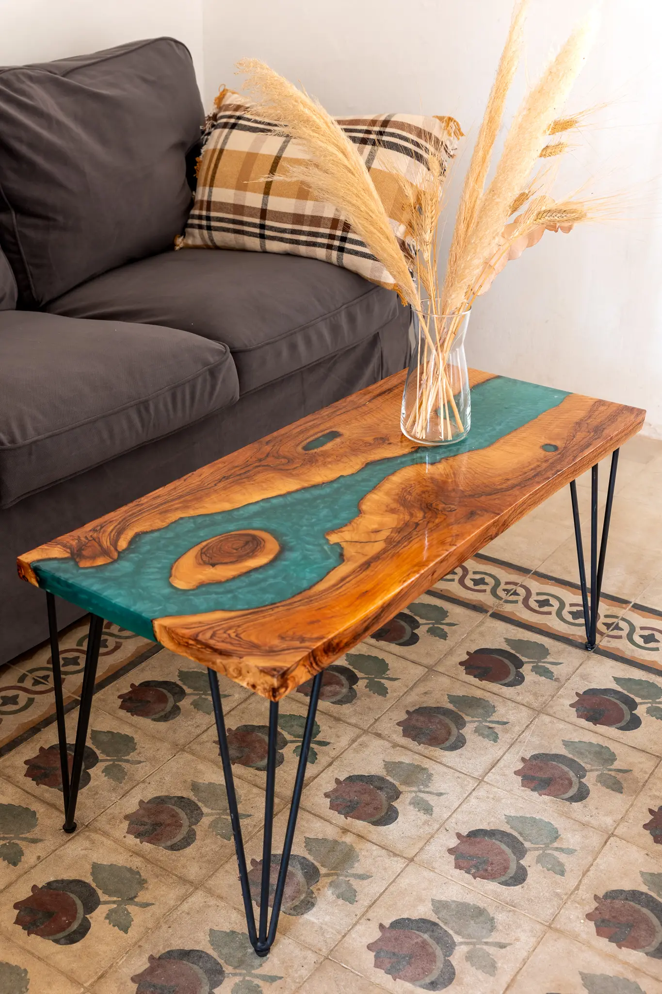 המשטח עבר גימור מוקפד להבלטת מרקם העץ והברקת האפוקסי, והשולחן ניצב על רגלי ברזל דקות בסגנון Hairpin ליציבות מודרנית וקלילה.